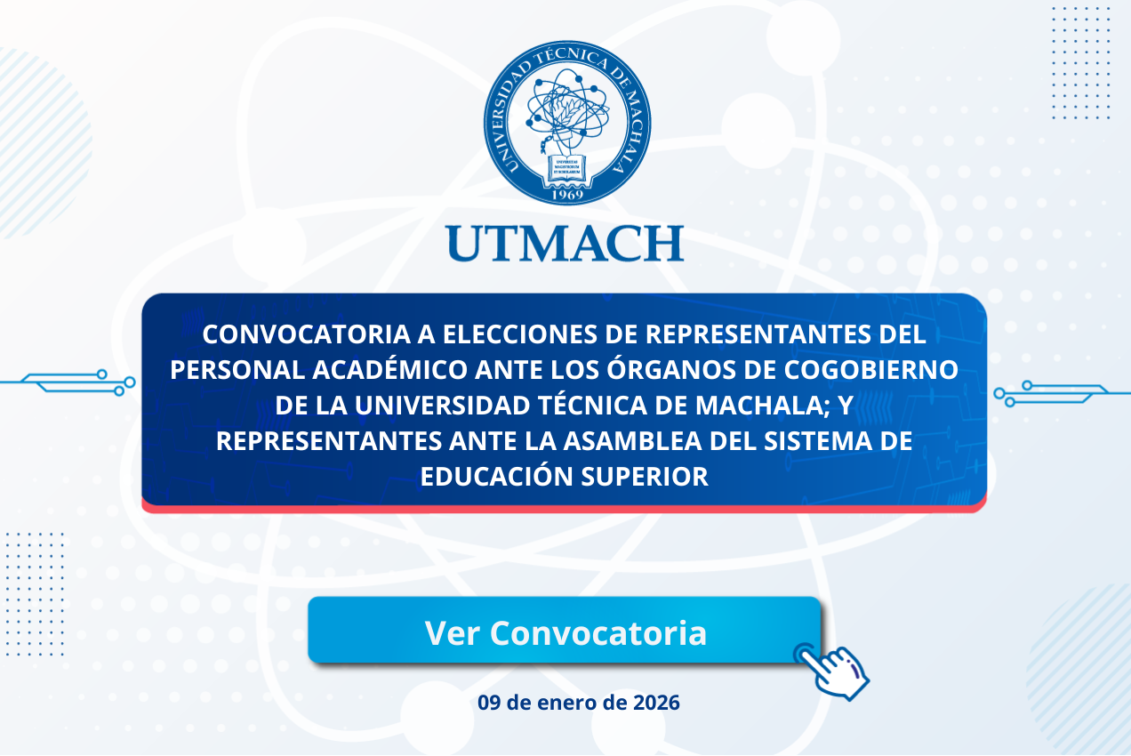 ACADEMIA POSGRADO VINCULACIÓN BIBLIOTECA INVESTIGACIÓN BIENESTAR UNIVERSITARIO, ARTE Y CULTURA FIC Facultad de Ingeniería Civil FCE Facultad de Ciencias Empresariales FCS Facultad de Ciencias Sociales FCA Facultad de Ciencias Agropecuarias FCQS Facultad de Ciencias Químicas y de la Salud DNA Dirección de Nivelación y Admisión NOTICIAS UTMACH 2025 NOTICIAS RECIENTES CONVOCATORIA PARA LA SELECCIÓN E INGRESO DE PERSONAL DE APOYO ACADÉMICO OCASIONAL PARA LOS CURSOS DE INGLES DE LA DIRECCIÓN DE EDUCACIÓN CONTINUA DE LA UNIVERSIDAD TÉCNICA DE MACHALA, PERÍODO 2026. enero 13, 2026 Convocatoria a Concurso Público de Merecimientos y Oposición para integrar el Personal Académico Titular de la Universidad Técnica de Machala – Julio 2025 julio 31, 2025 CONVOCATORIA PARA LA SELECCIÓN E INGRESO DE PERSONAL DE APOYO ACADÉMICO OCASIONAL PARA EL CURSO DE NIVELACIÓN DE LA UNIVERSIDAD TÉCNICA DE MACHALA, PERÍODO 2025-1 (Abril 2025) abril 21, 2025 Convocatoria para la selección e ingreso de personal académico ocasional y personal de apoyo académico ocasional de la Universidad Técnica de Machala (Marzo 2025) marzo 13, 2025 CONVOCATORIA PARA LA SELECCIÓN E INGRESO DE PERSONAL DE APOYO ACADÉMICO OCASIONAL PARA LOS CURSOS DE INGLÉS DE LA DIRECCIÓN DE EDUCACIÓN CONTINUA DE LA UNIVERSIDAD TÉCNICA DE MACHALA, PERÍODO 2025 febrero 10, 2025 RENDICIÓN DE CUENTAS 2022 Enlaces de Interés DIRECCIÓN DE ASEGURAMIENTO DE LA CALIDAD Calidad COMITÉ DE ÉTICA Comite de Ética DIRECCIÓN DE PLANIFICACIÓN Dirección de Planificación DIRECCIÓN DE EDUCACIÓN CONTINUA Centro de Educación Continua DIRECCIÓN DE BIENESTAR UNIVERSITARIO, ARTE Y CULTURA DIRECCIÓN DE BIENESTAR UNIVERSITARIO, ARTE Y CULTURA CONSULTORIO JURÍDICO GRATUITO CONSULTORIO JURÍDICO EXTENSIONES TELEFÓNICAS EXTENSIONES TELEFÓNICAS UTMACH UNIDAD DE COMPRAS PÚBLICAS PLAN ANUAL DE CONTRATACIÓN PÚBLICA 2021 CES Consejo de Educación Superior CACES Consejo de Aseguramiento de la Calidad de la Educación Superior SENESCYT Secretaría de Educación Superior, Ciencia, Tecnología e Innovación URKUND URKUND RAUEC RED DE ARCHIVOS UNIVERSITARIOS DEL ECUADOR RED DEES RED DE DIRECCIÓN ESTRATÉGICA EN EDUCACIÓN SUPERIOR